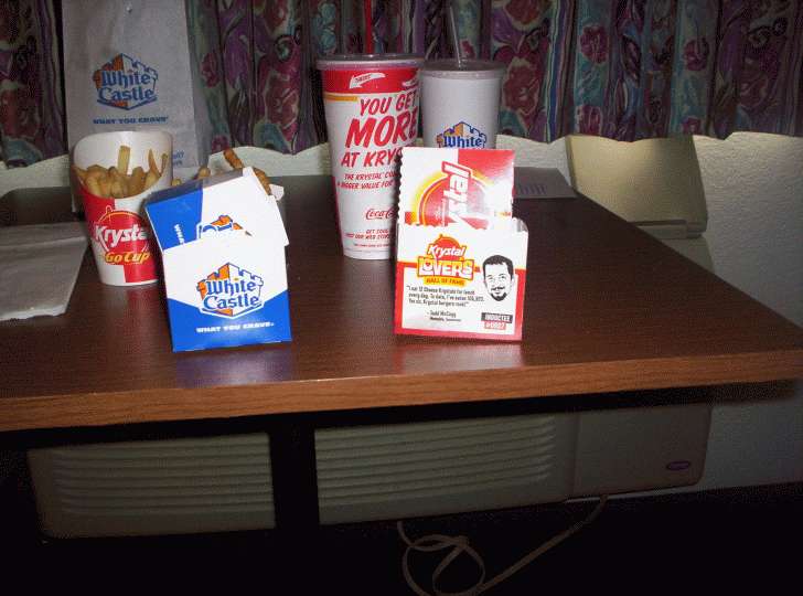 Anyway, years ago (around 1997, after my Krystal tradition had started) I happened to be up in Nashville for a hockey game (the the Macon Whoopee ve the old Nashville Nighthawks of the CHL) while driving through Nashville with my girlfriend, Jennifer, I saw a White Castle on the side of the road. In amazement I said "Wow! There's a White Castle!" Since Jennifer merely tolerated, not participated in my Krystal fixation, there was never a moment's though given to actually GOING to White Castle.